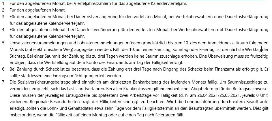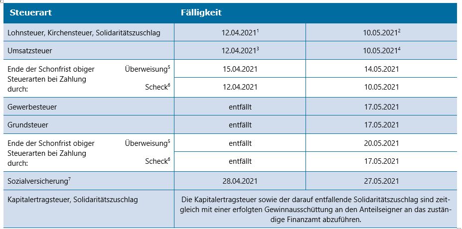 Corona-bedingte Betriebsschließung – Gastwirt bekommt von Versicherung keine Entschädigung23. April 2021Bundesfinanzministerium zur Abgrenzung zwischen Geldleistung und Sachbezug3. Mai 2021 Termine Steuern/Sozialversicherung: April/Mai 2021 23. April 2021 Kategorien Termine Tags