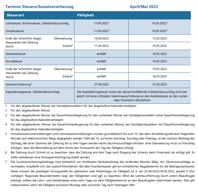 Verlängerte Sonderregeln zum Kurzarbeitergeld23. März 2022Billigkeitsregelungen: Steuerliche Maßnahmen zur Unterstützung der vom Krieg in der Ukraine Geschädigten27. April 2022 Termine Steuern/Sozialversicherung, April/Mai 2022 23. März 2022 Kategorien Termine Tags 04-2022