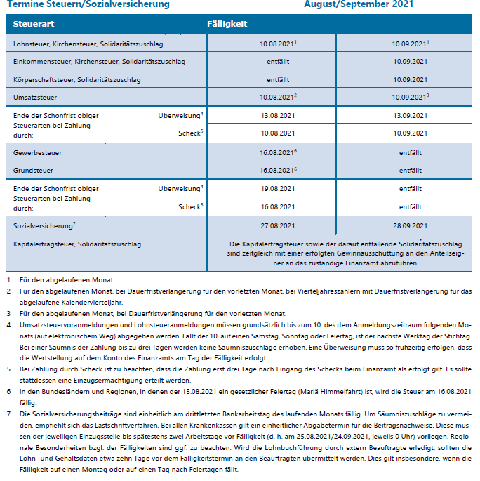 Antrag auf Wirtschaftsförderung: Exakte Angaben zwingend erforderlich15. Oktober 2021Steuerliche Maßnahmen zur Berücksichtigung von Schäden durch Unwetter mit Hochwasser29. Oktober 2021 Termine Steuern/Sozialversicherung, August/ September 2021 29. Oktober 2021 Kategorien Termine Tags 08-2021