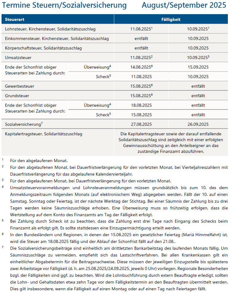 Bundesrat stimmt dem Gesetz für ein steuerliches Sofortprogramm zu28. Juli 2025Ist ein Gewinn aus dem Verkauf von Eintrittskarten für Fußballspiele oder Konzerte steuerpflichtig?21. August 2025 Termine Steuern/Sozialversicherung August/September 2025 28. Juli 2025 Kategorien Termine Tags 08-2025
