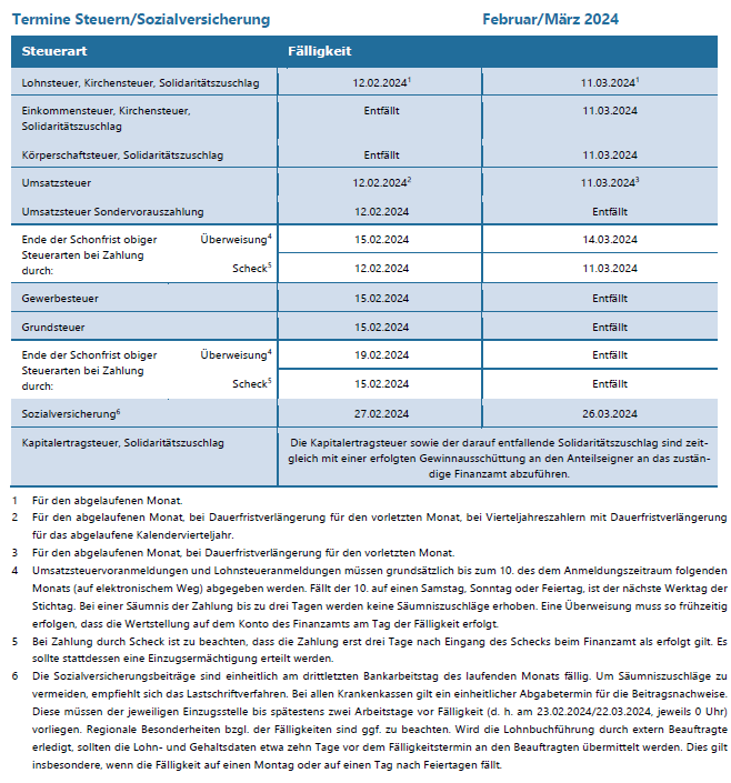 „Zweites Haushaltsfinanzierungsgesetz“ vom Bundeskabinett beschlossen22. Januar 2024Zuordnung der ersten Tätigkeitsstätte eines angestellten Bauleiters20. Februar 2024 Termine Steuern/Sozialversicherung, Februar/März 2024 20. Februar 2024 Kategorien Termine Tags 02-2024