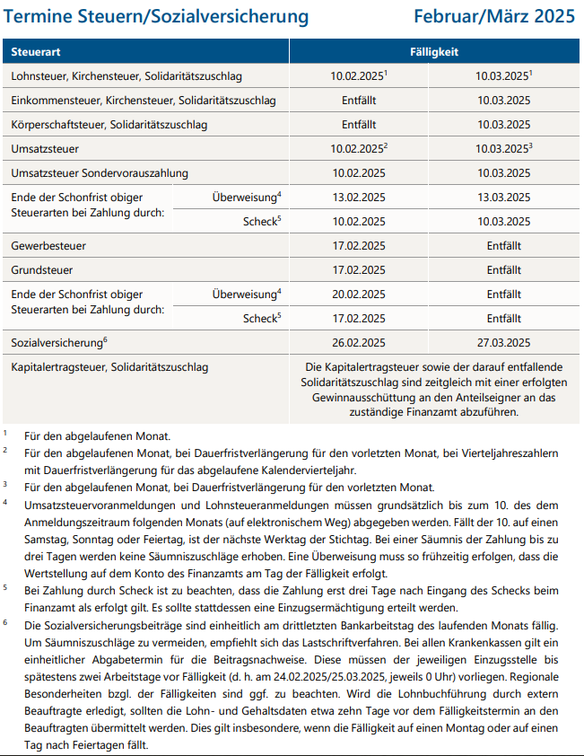 Solidaritätszuschlag: Freigrenzen steigen ab 202517. März 2025Erstattung der Einkommensteuer für einen Verdienstausfallschaden muss versteuert werden26. März 2025 Termine Steuern/Sozialversicherung Februar/März 2025 17. März 2025 Kategorien Termine Tags 02-2025