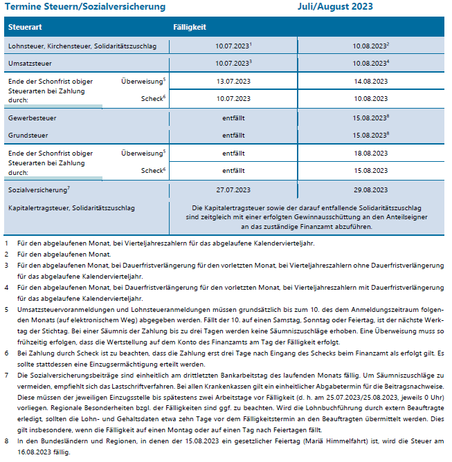 Pflegeunterstützungs- und -entlastungsgesetz tritt im Juli in Kraft21. Juni 2023Erhaltene Corona-Hilfen unterliegen nicht als außerordentliche Einkünfte einer ermäßigten Einkommensbesteuerung24. Juli 2023 Termine Steuern/Sozialversicherung, Juli/August 2023 21. Juni 2023 Kategorien Termine Tags 07-2023