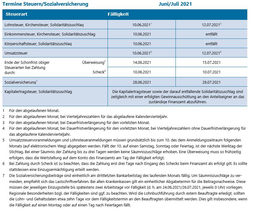 Wohnungseigentümerversammlung muss auch während COVID-19-Pandemie stattfinden9. Juni 2021Sind Verlustverrechnungsbeschränkungen für Aktienveräußerungsverluste verfassungswidrig?13. Oktober 2021 Termine Steuern/Sozialversicherung, Juni/Juli 2021 9. Juni 2021 Kategorien Termine Tags