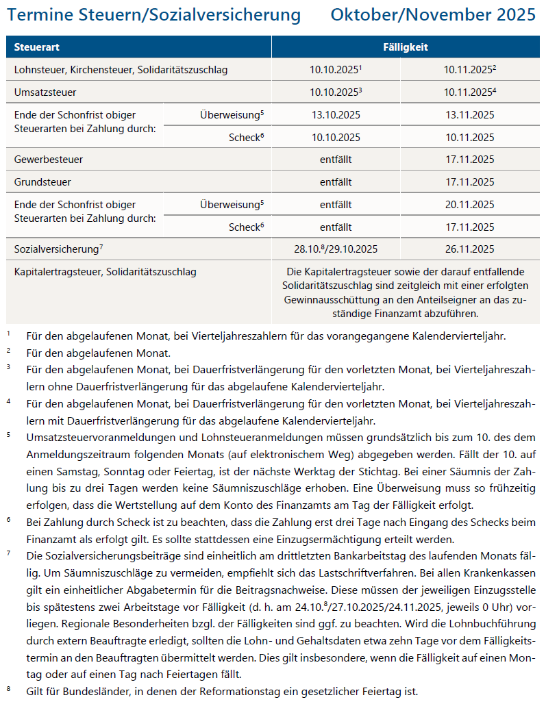 Bundeskabinett beschließt Zweites Betriebsrentenstärkungsgesetz22. September 2025 Termine Steuern/Sozialversicherung Oktober/November 2025 22. September 2025 Kategorien Termine Tags 10-2025