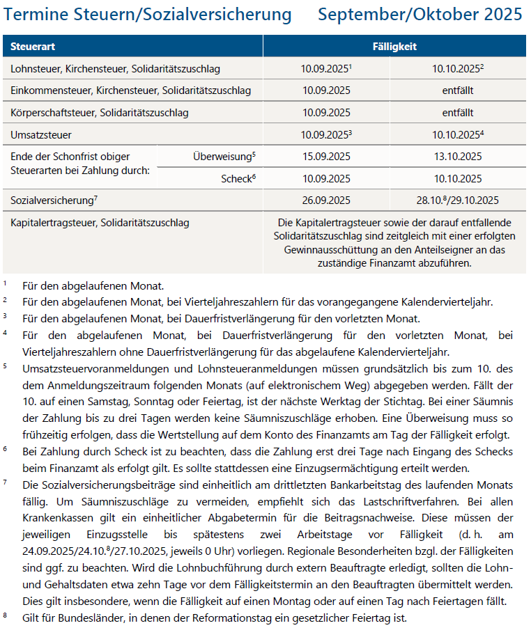 Senkung der Körperschaftsteuer ab 202821. August 2025Abzugsfähigkeit von Betriebsausgaben für „Incentive-Reisen“ von angestellten und freien Versicherungsvermittlern22. September 2025 Termine Steuern/Sozialversicherung September/Oktober 2025 21. August 2025 Kategorien Termine Tags 09-2025