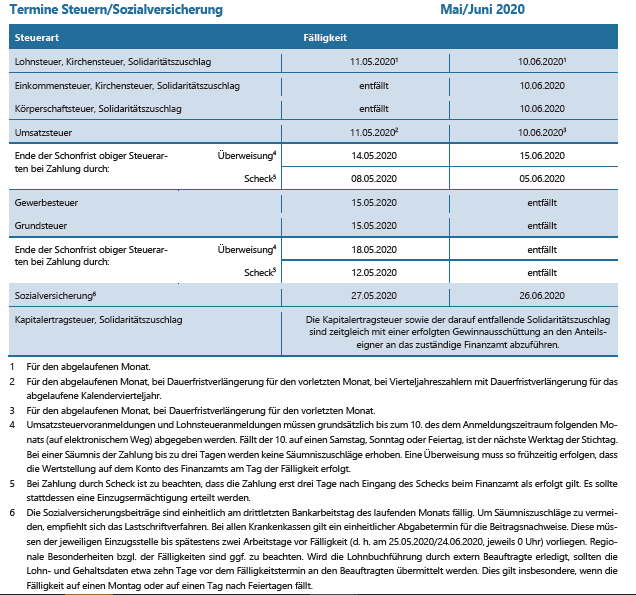 Termine Steuern/Sozialversicherung April/Mai 2020